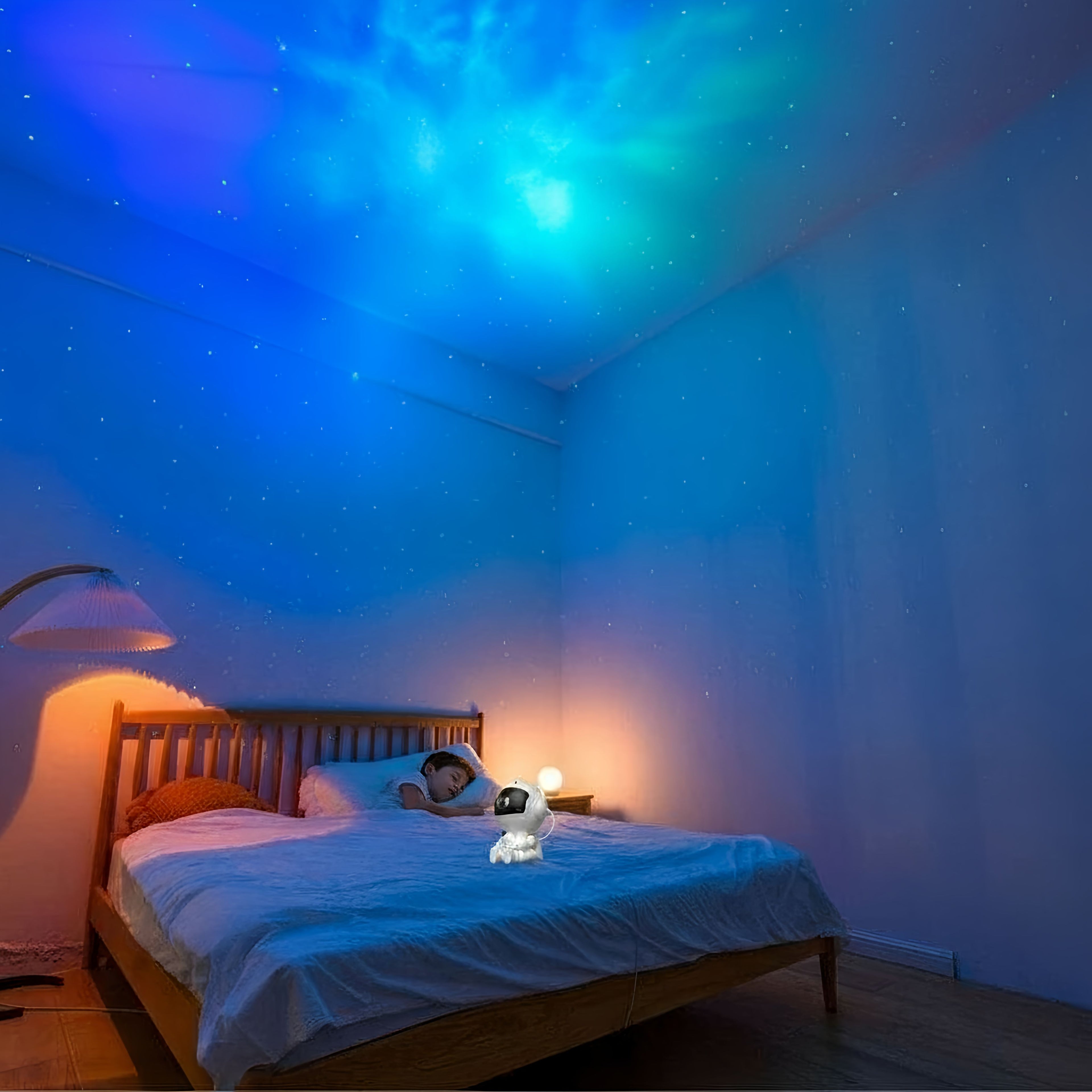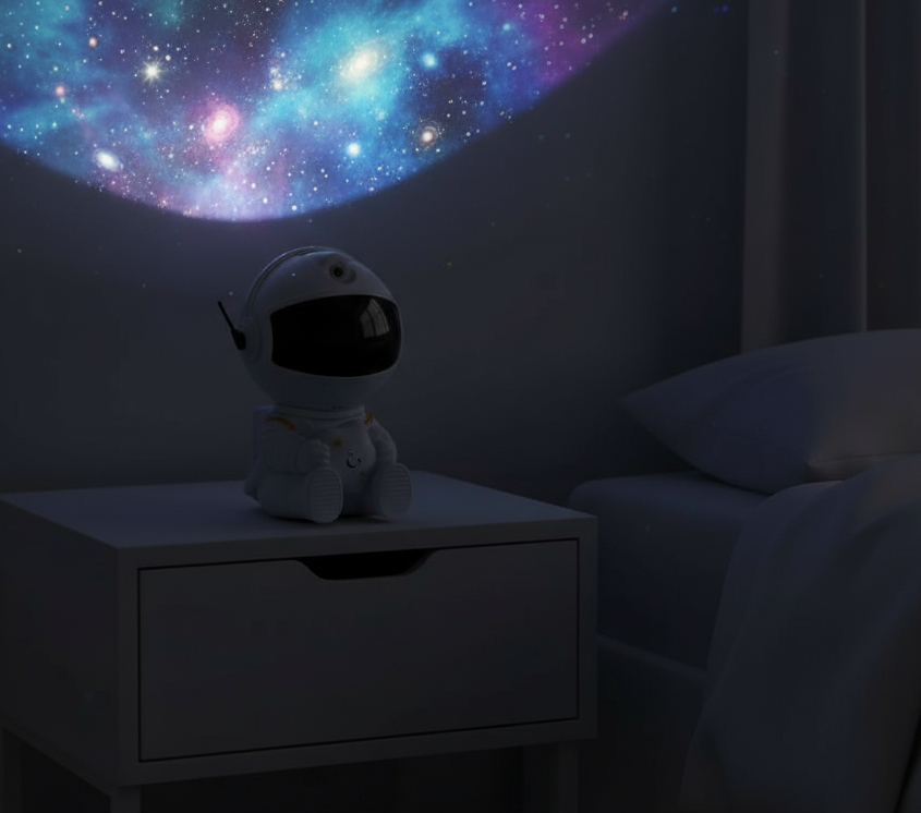 Stellux résout les difficultés du coucher avec une projection galaxie immersive. Un petit astronaute qui projette 8 univers lumineux différents, transformant chaque nuit en aventure spatiale apaisante.