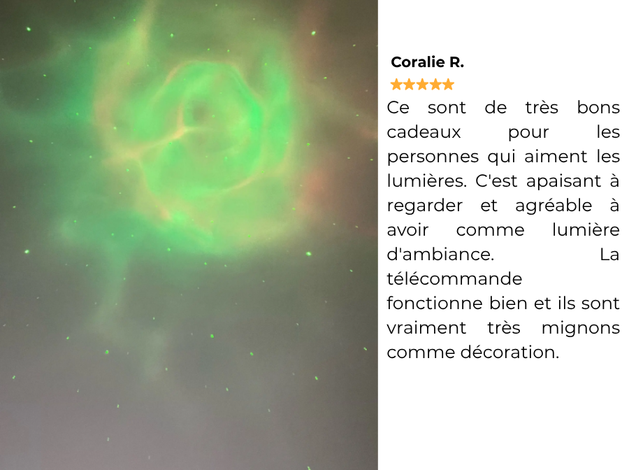 Le Stellux offre 8 effets lumineux distincts : des nébuleuses colorées HD et des étoiles vertes scintillantes, réglables en couleur et intensité.